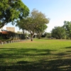 There is a seating area for skateboarders to rest. There is shade because of the large trees inhabited there. However, there is no footpath to use and the road and many bumps in it.