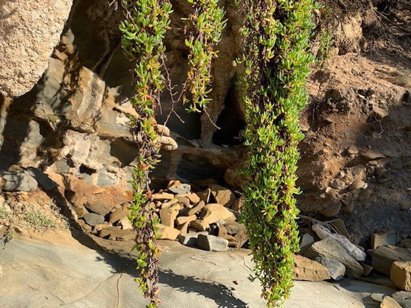There are a few grottos blown into the cliff faces along the shoreline, this one has pig-face curtains hanging in front.
