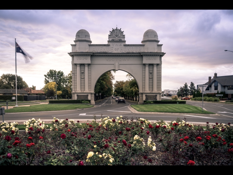 From here it's a short walk along Gillies Street on to Sturt Street. Once turning the corner you will see the Arch of Victory. A grand cement rendered masonry structure flanked by wide piers 20metres in width, spanning the roadway, and 18metres high. Crowned by the 'Rising Sun' symbol of the Australian Commonwealth Military Forces beneath which the words 'Avenue of Honour and Victory' are written prominently across the arch.