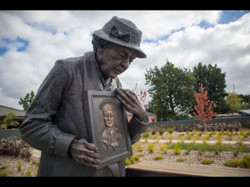 At the centre of the memorial space is a bronze sculpture of a mother clutching a photograph of her son by sculptor Peter Corlett who has created many war memorial public artworks. The memorial was unveiled on 15 February 2017 by Governor General Sir Peter Cosgrove and Mrs Kaye Baird, mother of posthumous Victoria Cross recipient, Corporal Cameron Baird.