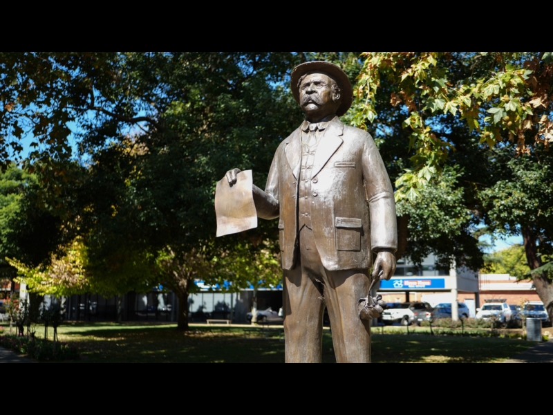 Joseph Furphy a writer and poet, who wrote under the name Tom Collins. A life like bronze of Joseph Furphy with a hand carved menhir (standing stone) with words from and about Joseph's writings.